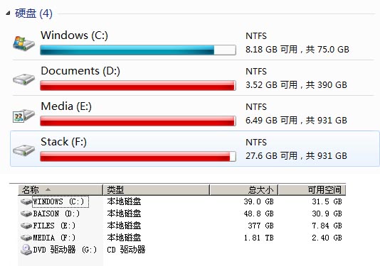 这回是真的没有磁盘空间了,看看吧,看看吧,服务器和自己现在用的电脑上面的都没有了,还有两台电脑是500G的硬盘,也准备临时用上了: